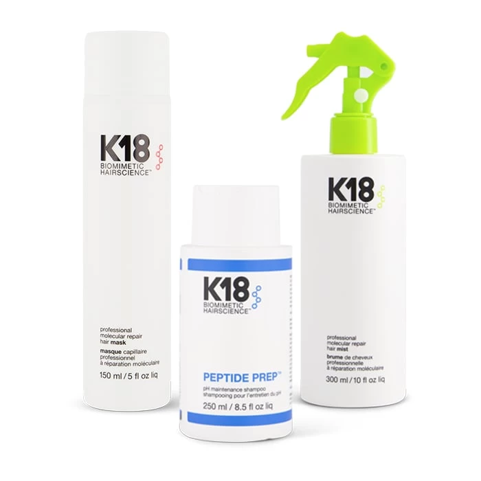 Allow hair to flourish in your salon with K18 Professional Trio Pack #1. There are three different products inside: one K18 Leave-In Molecular Repair Mist, one K18 Leave-In Molecular Repair Mask and one K18 Peptide Prep Ph Maintenance Shampoo.