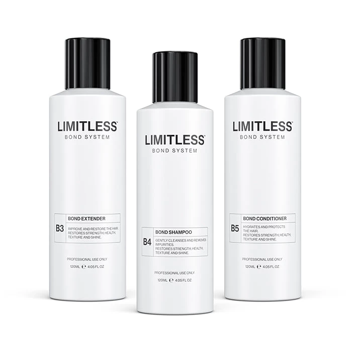 Limitless Home Care Kit contains three home-use products: Limitless B4 Bond Shampoo, Limitless B5 Bond Conditioner and Limitless B3 Bond Extender.
