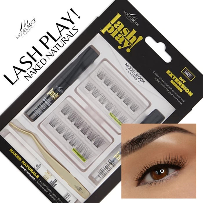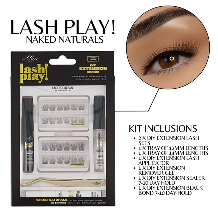 Create countless incredible looks with Modelrock LASH PLAY DIY Lash Extensions Kit NAKED NATURALS. There are eight products inside, including DIY Extension lash sets. There is one tray of 12mm lengths, one tray of 14mm lengths, lash applicator, remover gel, sealer 7-10 day hold and black bond 7-10 day hold.