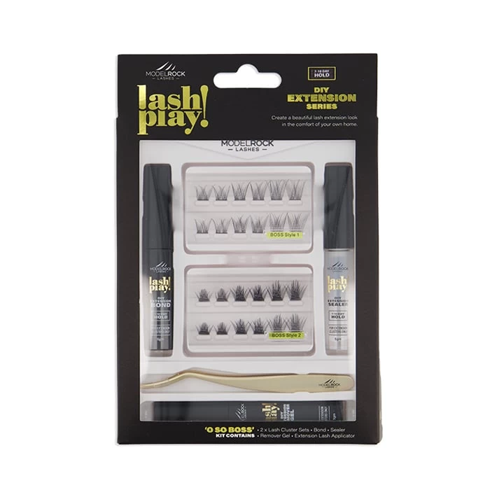 Create breathtaking looks with Modelrock LASH PLAY DIY Lash Extensions Kit O SO BOSS. Six items are inside, including two DIY Extension lash sets with mixed lengths of 10mm, 12mm and 14mm. Other additions are DIY Extension Lash Applicator, DIY Extension Remover Gel, DIY Extension Sealer 7-10 day hold and DIY Extension Black Bond 7-10 day hold.