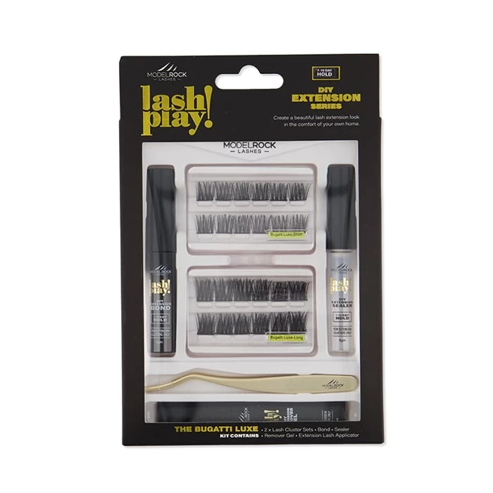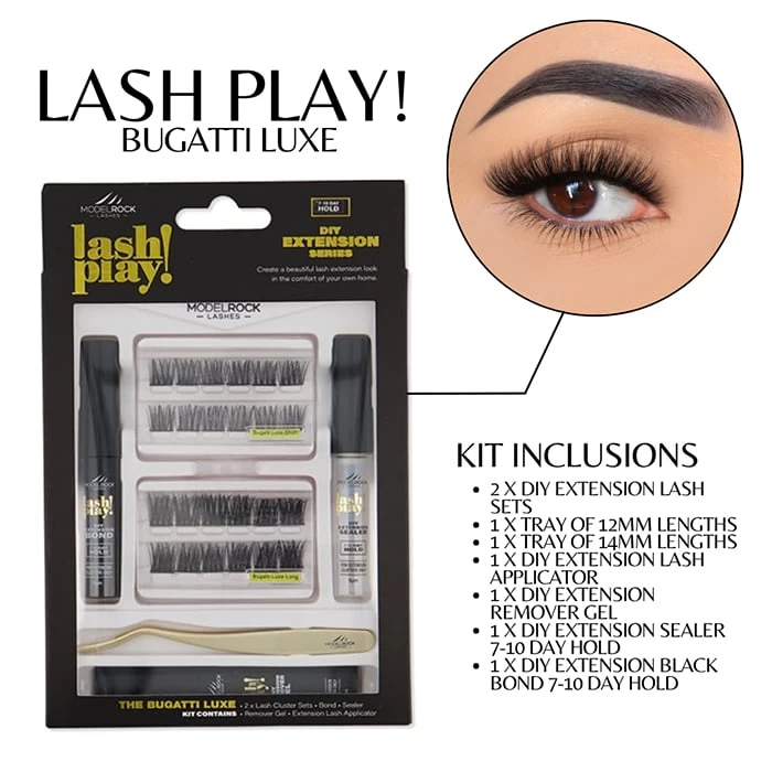 Create countless incredible looks with Modelrock LASH PLAY DIY Lash Extensions Kit THE BUGATTI LUXE. There are eight products inside, including DIY Extension lash sets. There is one tray of 12mm lengths, one tray of 14mm lengths, lash applicator, remover gel, sealer 7-10 day hold and black bond 7-10 day hold.
