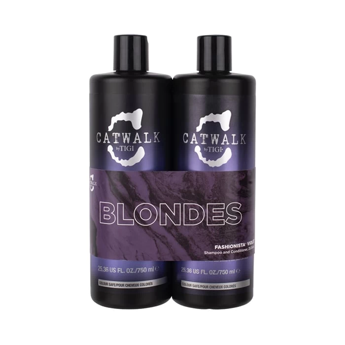 TIGI Catwalk Fashionista Violet Shampoo and Conditioner 750ml enhances blonde, white or grey hair while reducing yellow and brassy tones. Cools tones are boosted and illuminating shine added. With a luxurious blend of violet, pearl extract and rice milk, hair is left smooth and frizz-free.